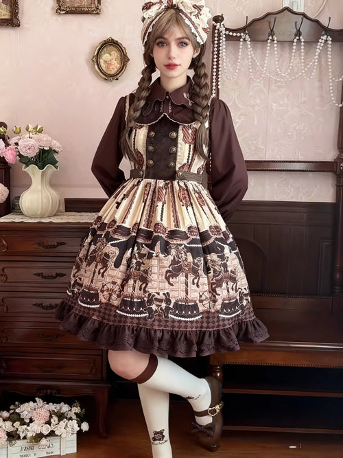 Sweet Lolita Carousel Themed Dress Pink Chocolate Brown Beige Print -
